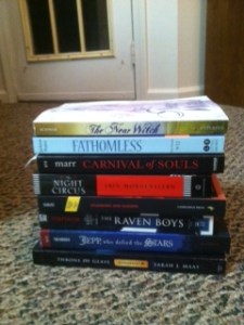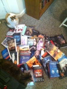 As some of you may know, I will be moving soon. It is quite exciting as it is a step in the right direction and will be a positive change in my life. However, this means that for a little while I will have LESS ROOM and more importantly, LESS BOOKCASES! Therefore, I decided to go through my bookcase filled with ARCs (and two finished books) from BEA and share the love with you all! I promise that nearly all EIGHTEEN books in the box are books I really want to read, and if you read the blog, we must have some of the same reading habits! Now I don’t want to tell you exactly what is in the box because really, what fun is that, but I will draw your attention to the pile of books I brought home from BEA and tell you that I am not sending away any of my signed copies!