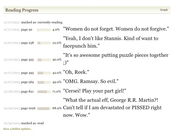 I made it! I read all 5 of the published books in A Song of Ice and Fire series! I FEEL SO ACCOMPLISHED!! Not only did I read them all (that’s around 5,000 pages) in TEN MONTHS! All while reading other books, working full time…and ya know LIVING LIFE! Also…I got a bit behind during Christmas, but I was determined. I made A Dance With Dragons my LAST READ OF THE YEAR and I literally read 57% of the book in five days. FIVE. *collapses* I feel accomplished, sure, but I also have quite the epic book hangover, and I miss those characters that were such a huge part of my life for almost a full year! Let’s get into the quickie review (no spoilers!)
